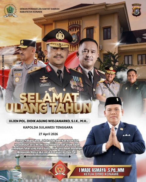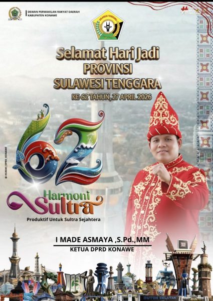 Nilkaz.com – KENDARI –Dewan Perwakilan Rakyat Daerah ( DPRD ) kabupaten Konawe turut menyemarakkan peringatan Hari Ulang Tahun (HUT) ke-62 Provinsi Sulawesi Tenggara (Sultra). Melalui unggahan resmi, Ketua DPRD KONAWE I Made Asmaya,S.Pd.,MM menyampaikan ucapan selamat sekaligus harapan besar bagi kemajuan Bumi Anoa